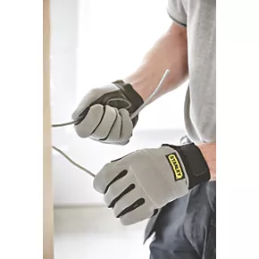 Large. Spandex back with synthetic leather palm, padded knuckle guards and rubberized index finger and thumb to provide extra grip, dexterity, durability and protection. Breathable back ensures all-day comfort.